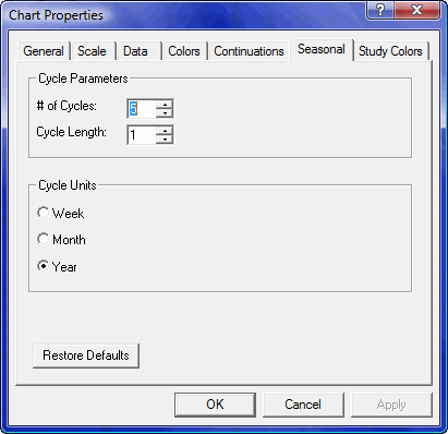 The Seasonal tab enables you to set properties that pertain to Seasonal charting and analysis.
