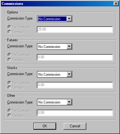 If you choose the Per Contract Calculation Type, this field contains the flat fee paid for options commissions. This fee is multiplied by the quantity of instruments to calculate the round-trip commission. If you choose the User Formula Calculation Type, this field contains an expression, written in Aspen's formula language, for calculating options commissions. For example, the formula,