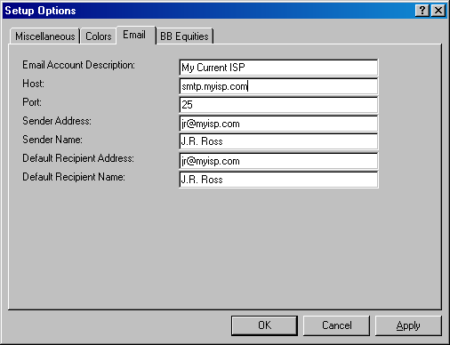 The Email tab enables you to set up information about your ISP's email server so that you can create alarms that will email or text message you when the alarm triggers.
