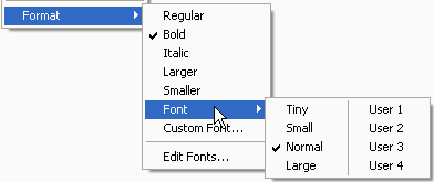 Use the Custom Font… selection to directly affect the font in the active window. Use the Edit Fonts… selection to modify the User fonts.