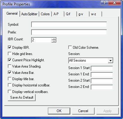 The Market Profile Properties dialog contains seven tabs. From right to left, the A-P, Q-f, g-v, and w-z tabs control the color of Time Price Opportunities (TPOs). The Colors tab controls the color of attributes like grid lines, background, and price highlights. The AutoSplitter contains settings that are only available if you subscribe to Market Profile+.