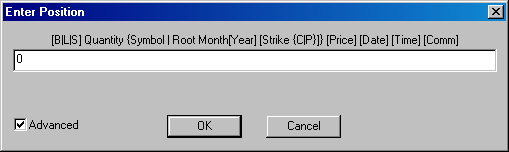 All these examples indicate whether you're buying or selling, how many instruments are involved, the symbol or, in the case of options, the underlying root, the expiration, the strike price (options), the instrument type (options call or put). Clearly, if you're entering a transaction in an underlying instrument, strike price and instrument type information are irrelevant. Other optional information includes, entry price, entry time, and commission amount. The enter position field expects information in a particular order.