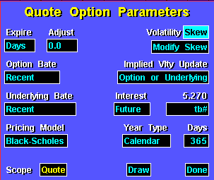 For example, .MODIFY OEXN405C VLTY 7.95 records a volatility of 7.95 in your database record for the OEX 405 call. When Database volatility is selected, Aspen Systems uses the value in an Option’s MTAB.DAT record for its volatility. If the option's MTAB.DAT record contains a volatility of zero (0), Aspen Systems uses the volatility (VLTY) in the underlying instrument’s MTAB.DAT record.
