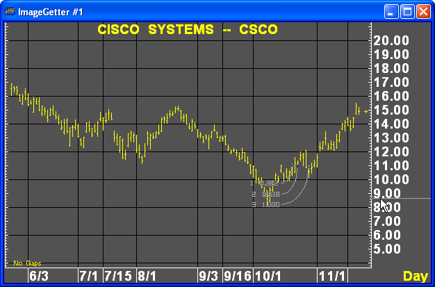 A click is assumed to refer to the high, low, open, or close of a displayed bar; the software locates the nearest such point and uses it as the exact reference point. To be more precise, the software first finds the horizontally nearest bar column, then chooses the vertically closest reference point within that column. If multiple data items are on display, the one with the vertically closest reference point is chosen. (Formula data items are not eligible to be chosen.) Only high and low points are eligible.