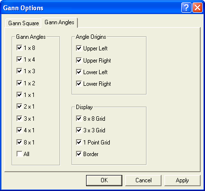 The Gann Angles settings affect Gann Squares, Gann Time Price Angles, and Speed Lines. You set angles by clicking on the Gann Angles Tab: