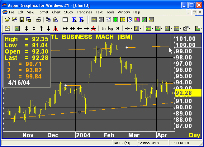In the image below, note the location of the mouse pointer, and the content of the cursor window. The price level of all three trend lines are displayed in the cursor window: