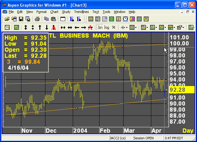 When there are many trend lines on a chart, note that the cursor window displays only one of the trend lines. You control which trend line is displayed in the cursor window by positioning the mouse pointer on or near the trend line you want displayed. Then, hold down the right mouse key and click the left mouse key.