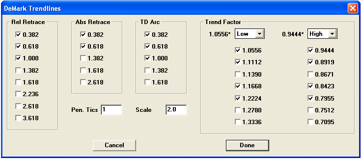 Enabled by subscription. Displays the DeMark Trendlines dialog: