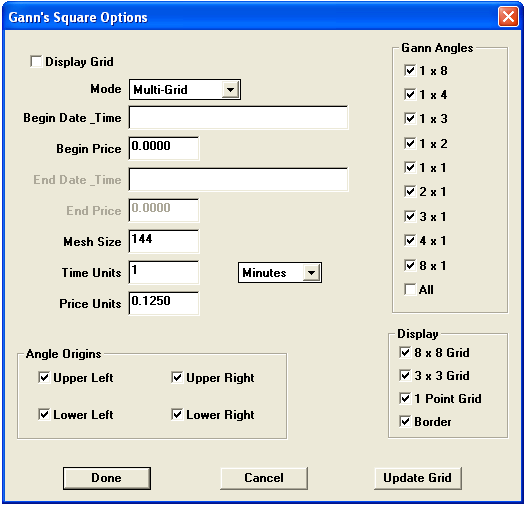 Displays the Gann's Square Options dialog: